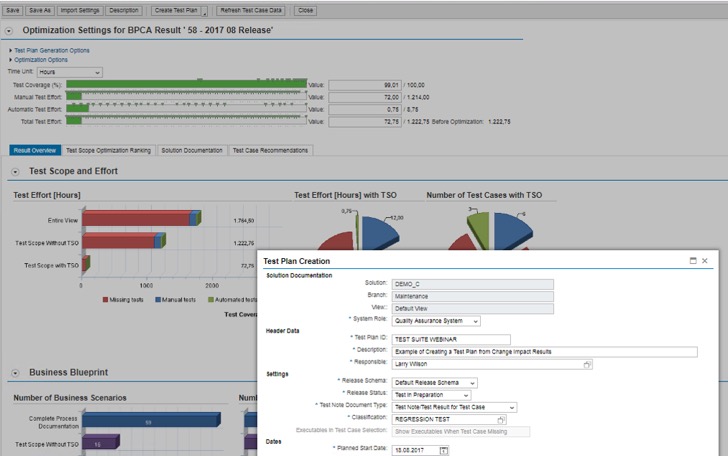Test Suite Scope and Effort Analyzer (SEA) and Business Process Change Analyzer (BPCA) derive test scope and optimizes effort for regression tests. Manual and Automated Tests and impacted identified as impacted and in scope reduce the time needed to repair those tests need repairing for testing releases, enhancement and support pack stacks, legal changes, and transformation projects. Tests identified by Test Scope Optimization are used to automatically create a Test Plan.